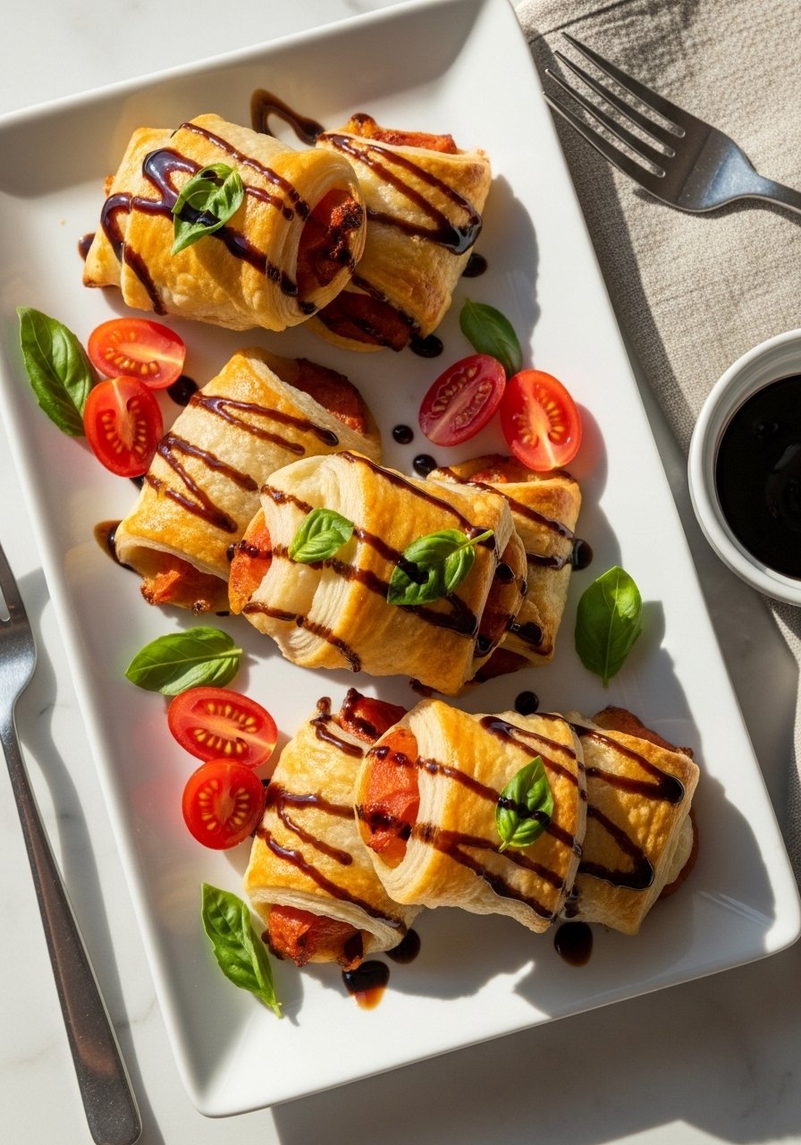 Serve on a white platter with extra balsamic glaze for dipping and sprigs of basil for color. These look great on a wooden serving board or cake stand for a buffet. Pair with a light Prosecco or a dry rosé. Store leftovers in an airtight container in the fridge for up to 2 days; re-crisp in a 350°F oven for 5–8 minutes.