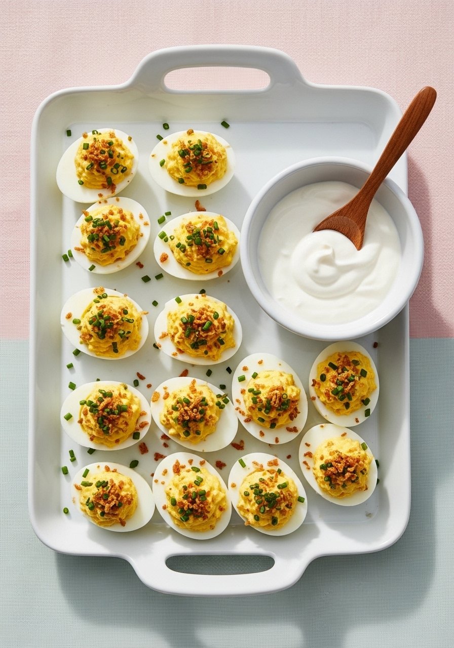 These deviled eggs add tangy sour cream and savory onion notes for a retro-but-refreshed appetizer. The texture is creamy with a little crunch from fried shallots or chives on top. They make a perfect plate on picnics, potlucks, or casual gatherings—easy to scale and always a crowd favorite.