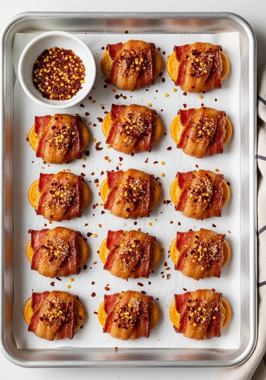 - Sprinkle brown sugar evenly across bacon-topped crackers, then dust lightly with red pepper flakes.