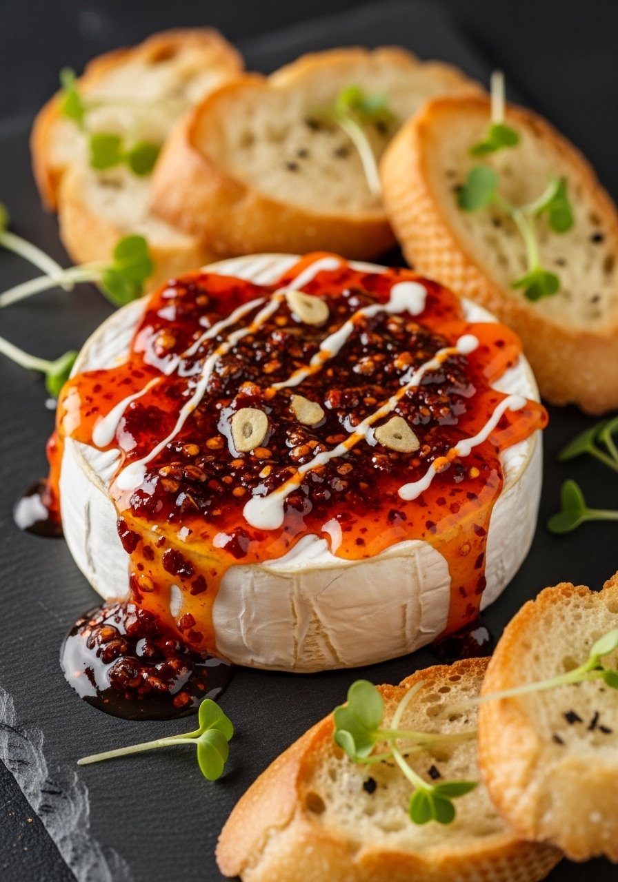 This is a viral-style Brie bake that layers sweet chili sauce with chili crunch oil for an umami-packed, sweet-and-spicy dip. It’s a show-stopper that’s simple—bake the Brie and spoon on the condiments. The contrast of crunchy chili bits against gooey cheese is seriously satisfying.