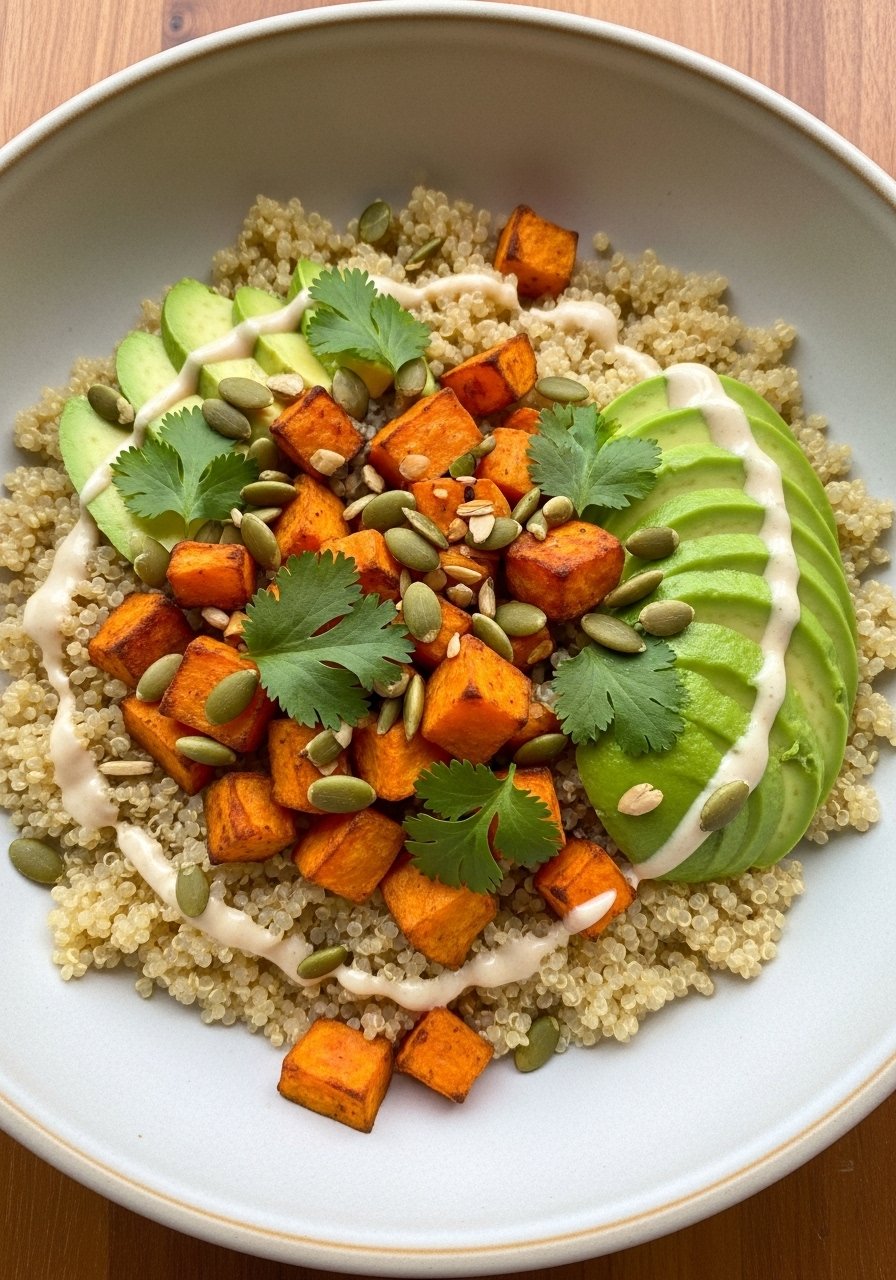 - Divide quinoa into bowls or meal prep containers. Top with roasted sweet potato, avocado slices, and pumpkin seeds.