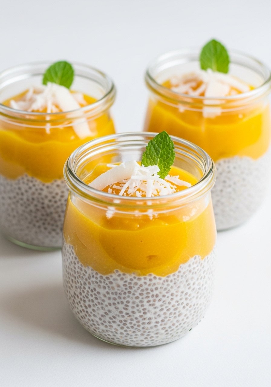 - Layer chia pudding and mango puree in jars. Top with shredded coconut.