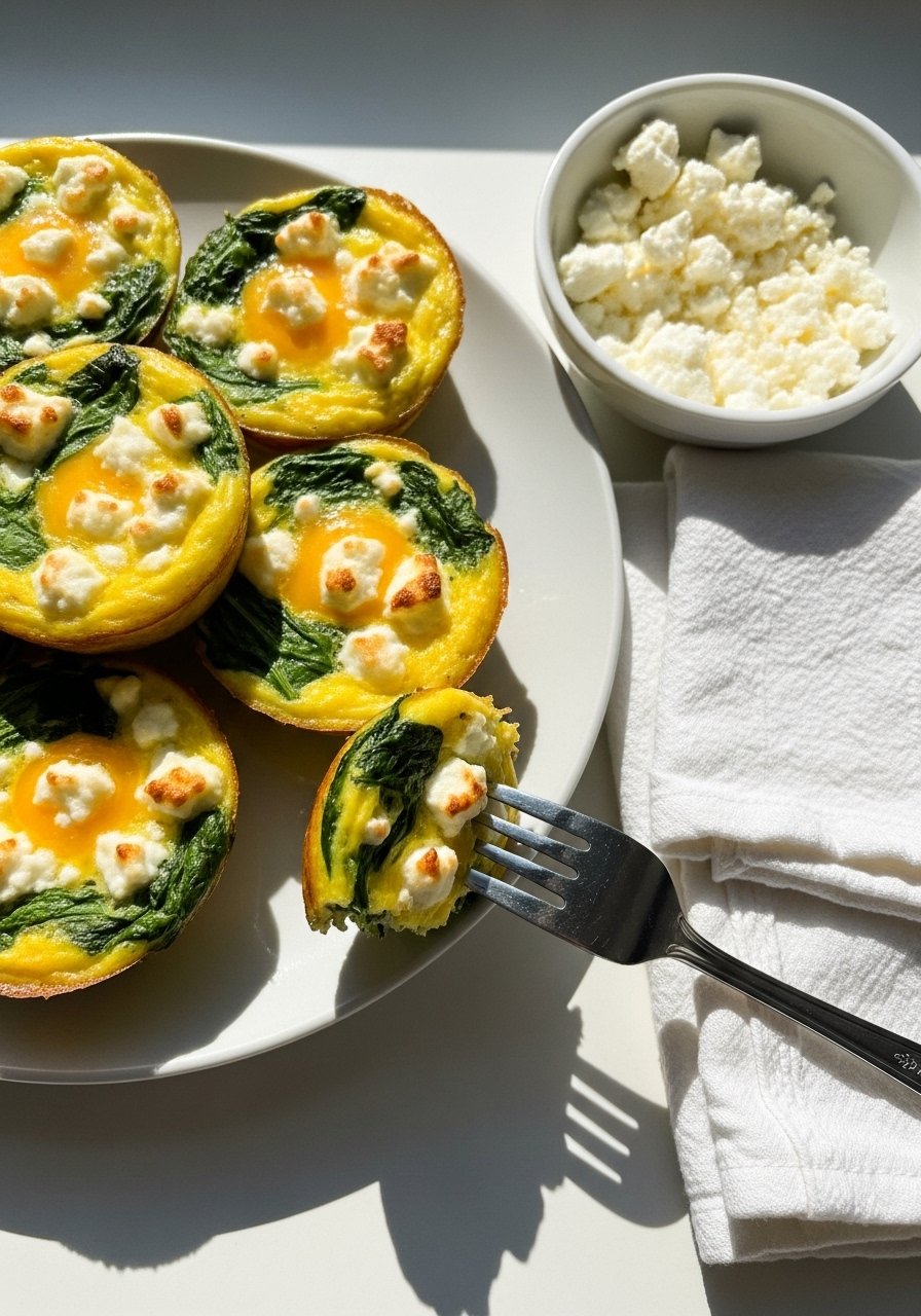 These mini frittatas are elegant bites with Mediterranean flavor—tangy feta, tender spinach, and bright herbs. They’re easy to portion, freeze well, and are a great vegetarian protein option.