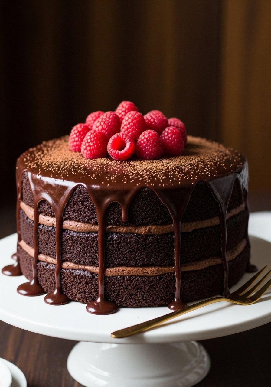 Serve slices on a simple white cake stand for a bakery look. Garnish with fresh raspberries and a dusting of cocoa. Pair with espresso or a bold red wine. Store leftovers in an airtight container in the fridge for up to 4 days. You can assemble ahead: keep ganache chilled and pour it just before serving.