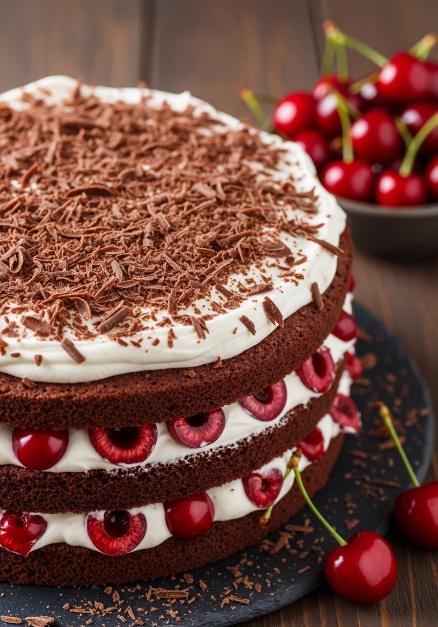 Serve chilled with extra cherries on top and chocolate curls. A cake stand shows off layers beautifully. Store in the fridge for up to 3 days in an airtight container. Make the cherry filling a day ahead for easier assembly.