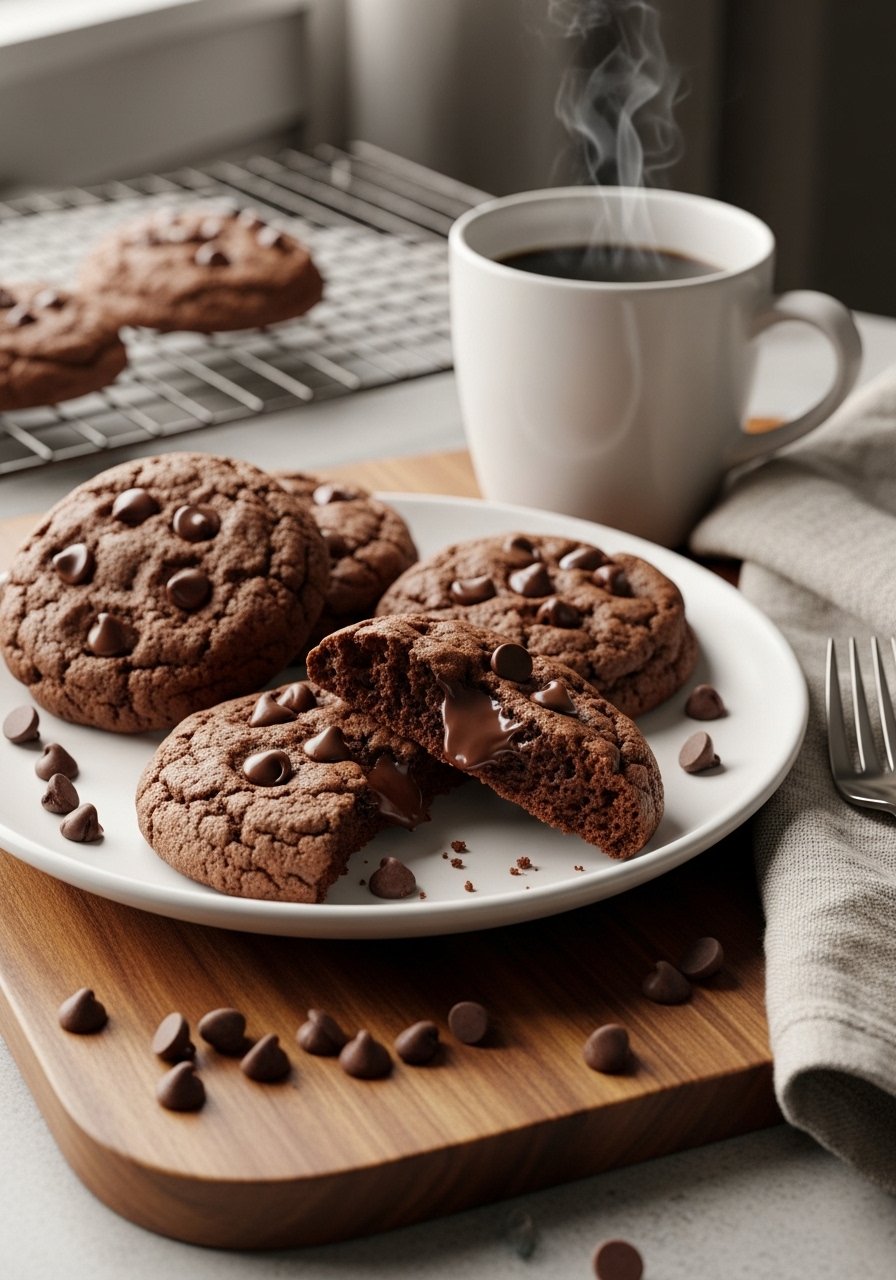 If you love an intense chocolate hit, these double chocolate cookies are dense, fudgy, and chewy. Cocoa and melted chocolate combine to keep the centers soft while the edges crisp slightly. They’re almost brownie-like.