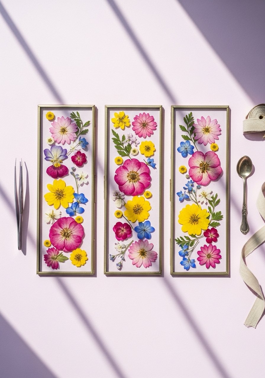 - 6–8 fresh flowers (roses, pansies, ferns) pressed and dried for 2–3 weeks