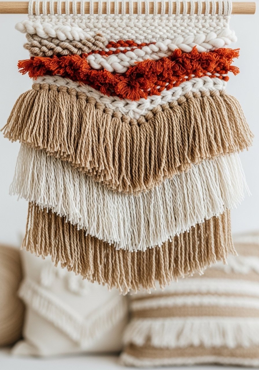 Soft, layered yarn hangings create warm texture and movement. This pattern mixes looped and cut fringe for a tactile piece that smells faintly of fresh cotton.