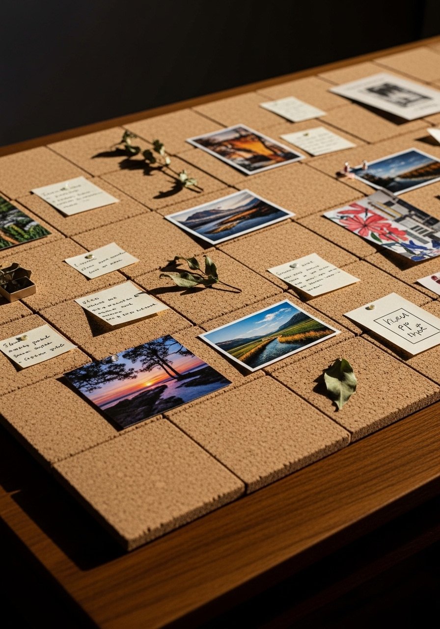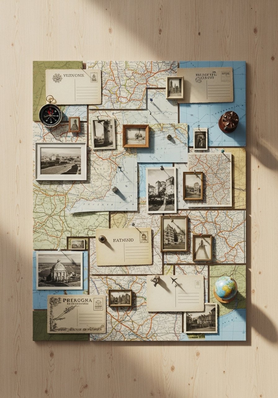 Hang in a hallway or office for daily inspiration. Use acid-free tape to protect prints. Replace items as you travel more—store extras in a photo box.