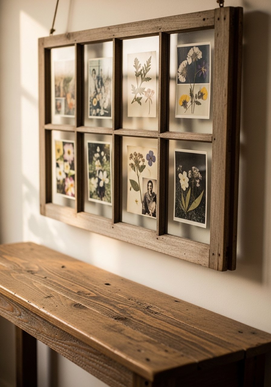 Old window frames offer vintage charm and segmented displays for photos or small artworks. Each pane tells a little story.