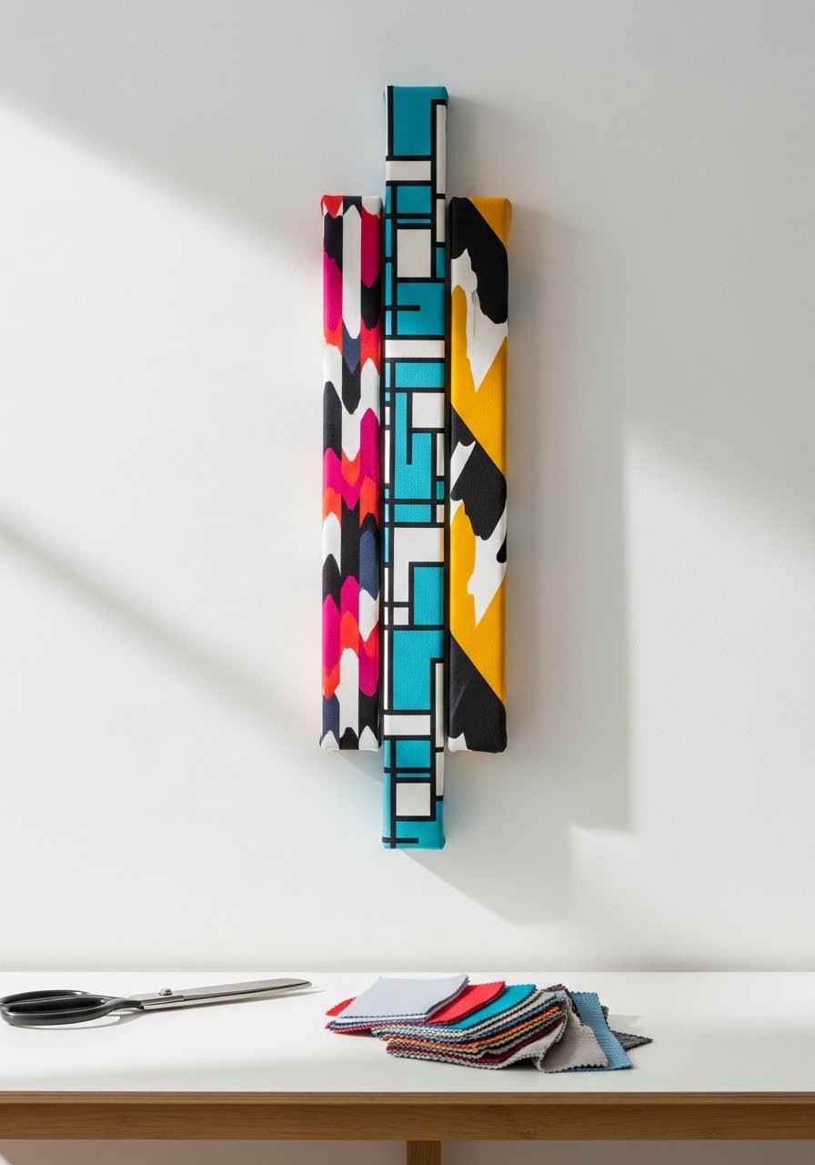 Fabric-wrapped panels are an easy way to add pattern and color. Stretch fabric over canvases for clean, framed textile art.