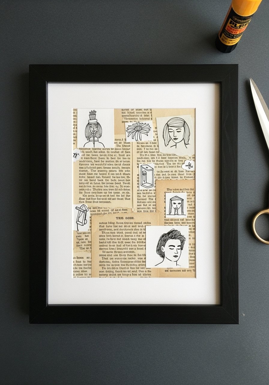 Book page collage is literary and textured—ideal for libraries or reading nooks. Layer pages, illustrations, and small sketches for depth.