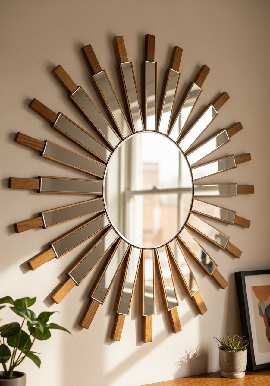 A sunburst mirror brings sculptural shine. Use small mirror tiles and painted wood or metallic rays for dynamic reflections.
