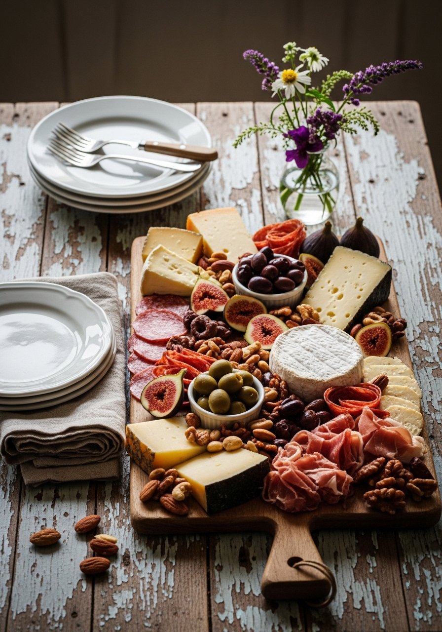 Serve on a long wood board or several small platters to create a collected display. Garnish with edible flowers for color. Pair with a light red wine or sparkling water with citrus slices. Store leftovers in airtight food containers for up to 3 days. Make the board ahead by prepping components; assemble just before guests arrive.