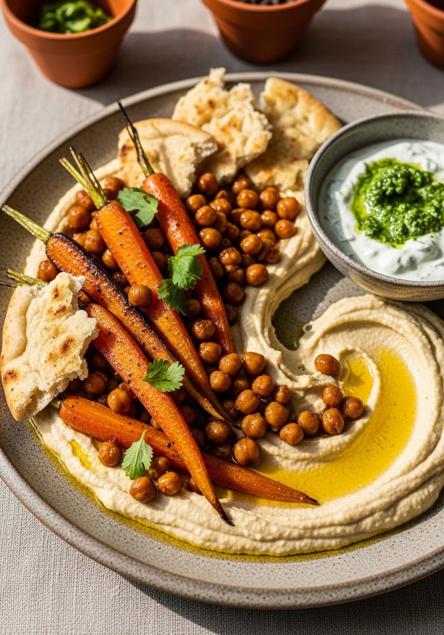 - Assemble platter with bowls of hummus (optional store-bought), roasted carrots, chickpeas, herb yogurt, and flatbreads.