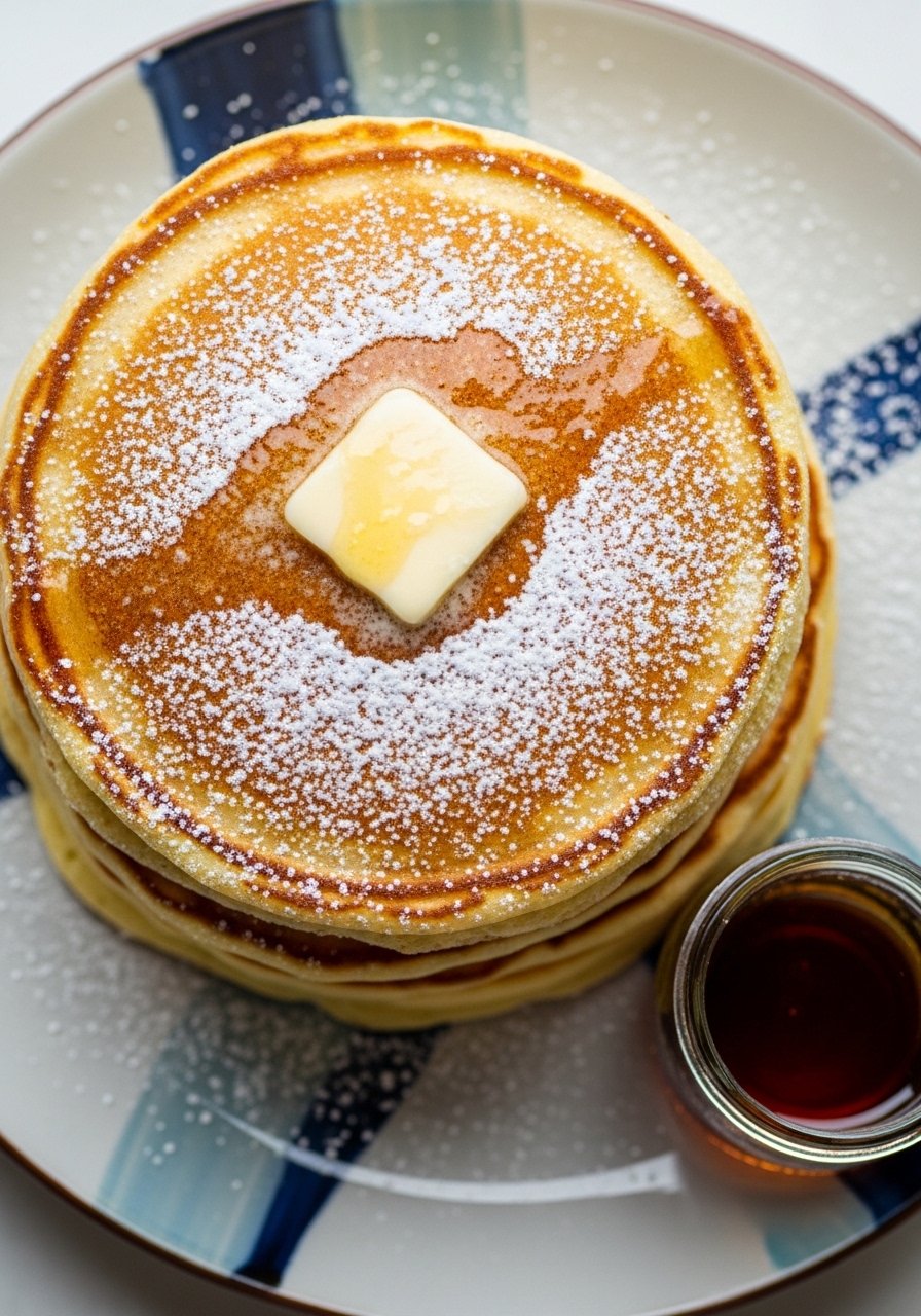 Stack pancakes on a plate and top with powdered sugar, lemon slices, and maple syrup. Store leftovers tightly in airtight containers and reheat in a skillet.