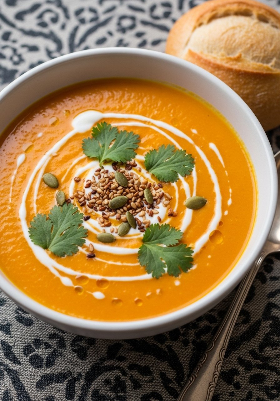 This spiced carrot soup is warm, aromatic, and pairs well with textured bowls and colorful textiles common in eclectic homes. It’s silky and fragrant with cumin and coriander.