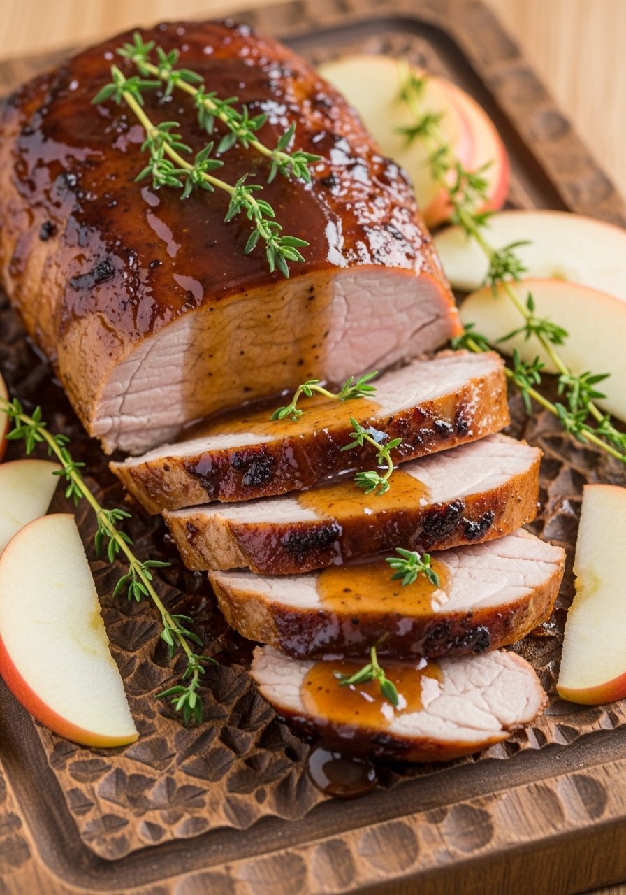 This maple-glazed pork tenderloin is savory-sweet and sliceable — ideal for family dinners or small gatherings styled with wooden boards and mixed ceramics.