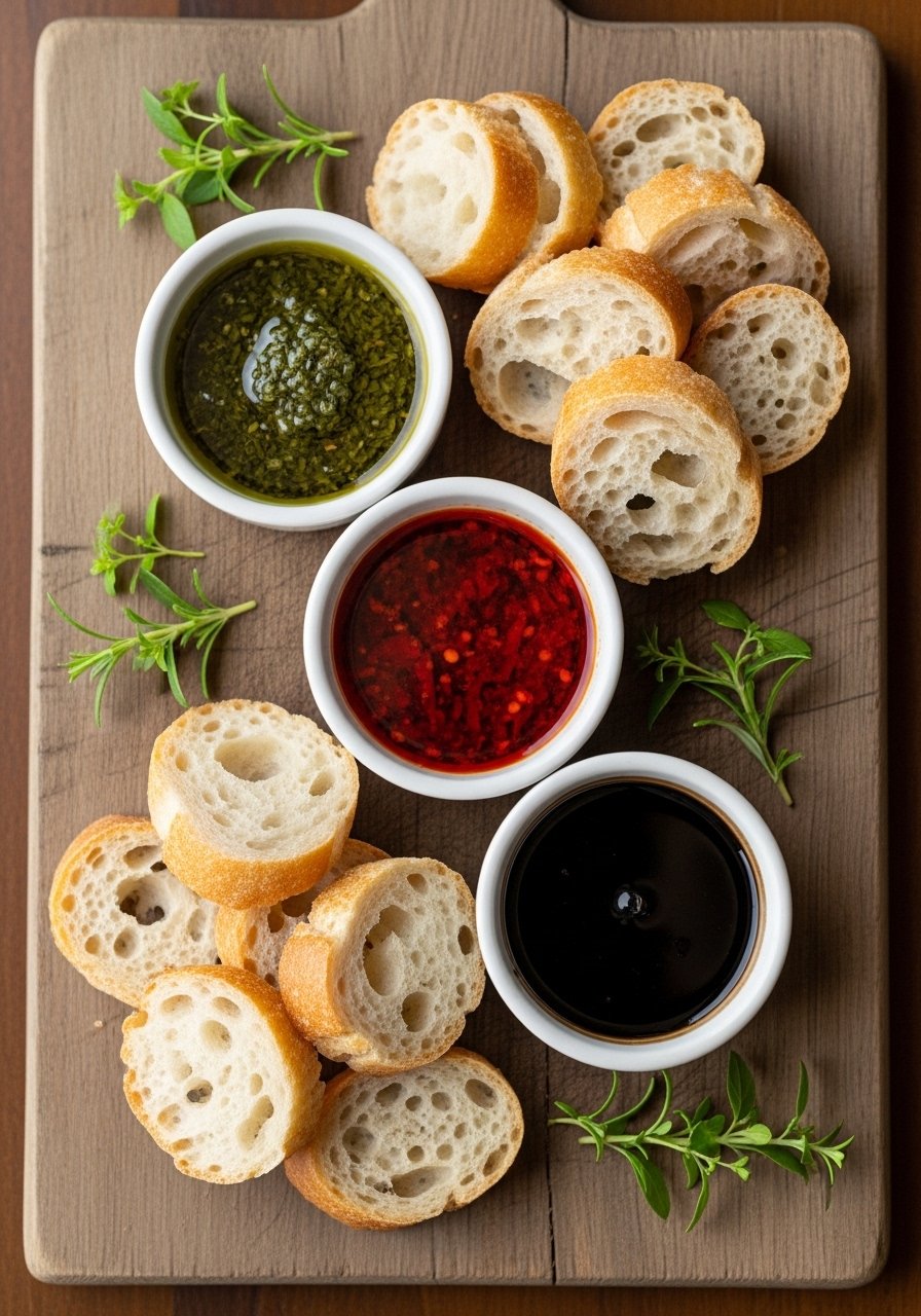 A set of infused oils and dips allows guests to customize flavors and adds a collected, artisanal touch to any table. It’s easy to prepare and looks elegant on small bowls or a narrow tray.