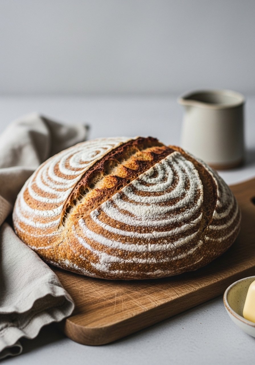 This no-knead bread is rustic and reliable — a tactile, slow-baked loaf that complements an eclectic table filled with tactile objects. The crackling crust and open crumb make it ideal for tearing and sharing.