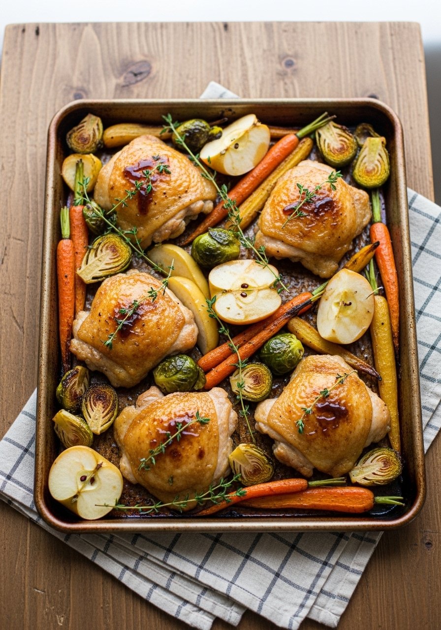 This one-pan fall meal hits sweet, savory, and crispy notes all at once. Chicken thighs roast to juicy perfection while Brussels sprouts get spotted and crunchy and apples caramelize into sweet pockets. The maple-dijon glaze gives a cozy warmth that tastes like fall on a fork. Busy weeknights and hungry families will love this — it’s easy to scale for guests, and the aroma of roasting herbs and maple fills the whole kitchen.