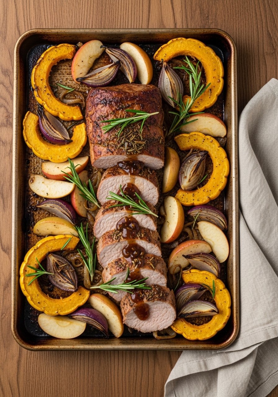Slice pork into medallions and arrange over the roasted squash and apples. Spoon pan juices over everything and garnish with rosemary. Store leftovers in glass meal prep containers for up to 4 days; reheat in a 350°F oven to keep textures. This one-pan fall recipe is a great option when you want minimal cleanup and maximum harvest flavor.