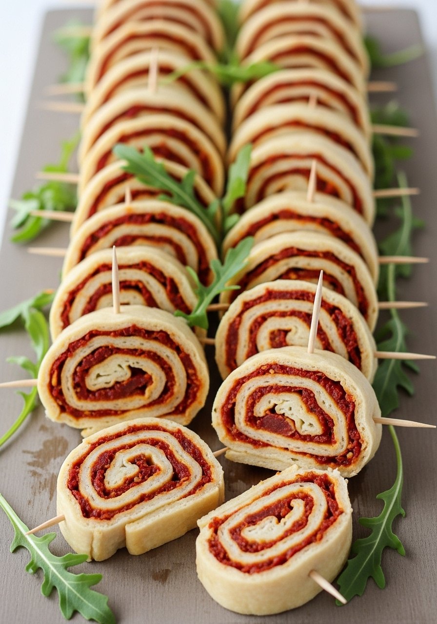 Pinwheels are bright, portable, and visually appealing—tight rolling is the trick. These Italian-American-style bites are creamy and tangy with a perfect spiral presentation. Chill before slicing for clean rounds.
