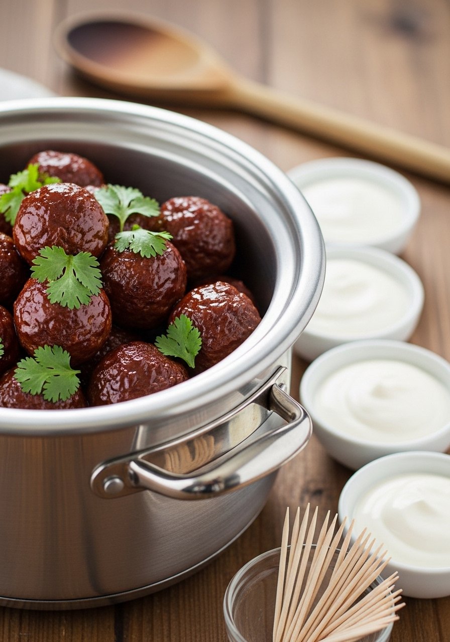 Serve warm from the slow cooker in a bowl with a ladle and toothpicks for guests. Leftovers freeze well—place cooled meatballs in freezer-safe containers for up to 3 months and reheat in a pot or microwave.