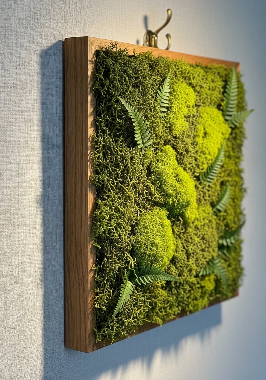Mount the moss frame at eye level for a calming effect. Pair with a wooden shelf and small ceramic vases for contrast. For hallway displays, group three frames in a row for continuity. To store between seasons, keep in an airtight box in a cool, dry place—use airtight containers if needed. This piece is low maintenance and never needs watering.