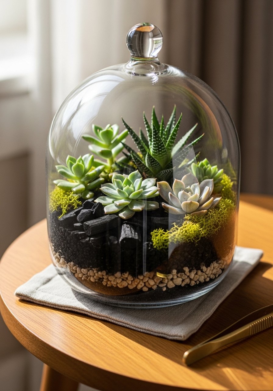 Display the terrarium on a windowsill with bright, indirect light or a shaded desk. Mist sparingly—succulents prefer dry conditions. Re-pot into a larger container when roots crowd; use glass planters for a clean display. Terrariums make elegant table centerpieces for small gatherings.