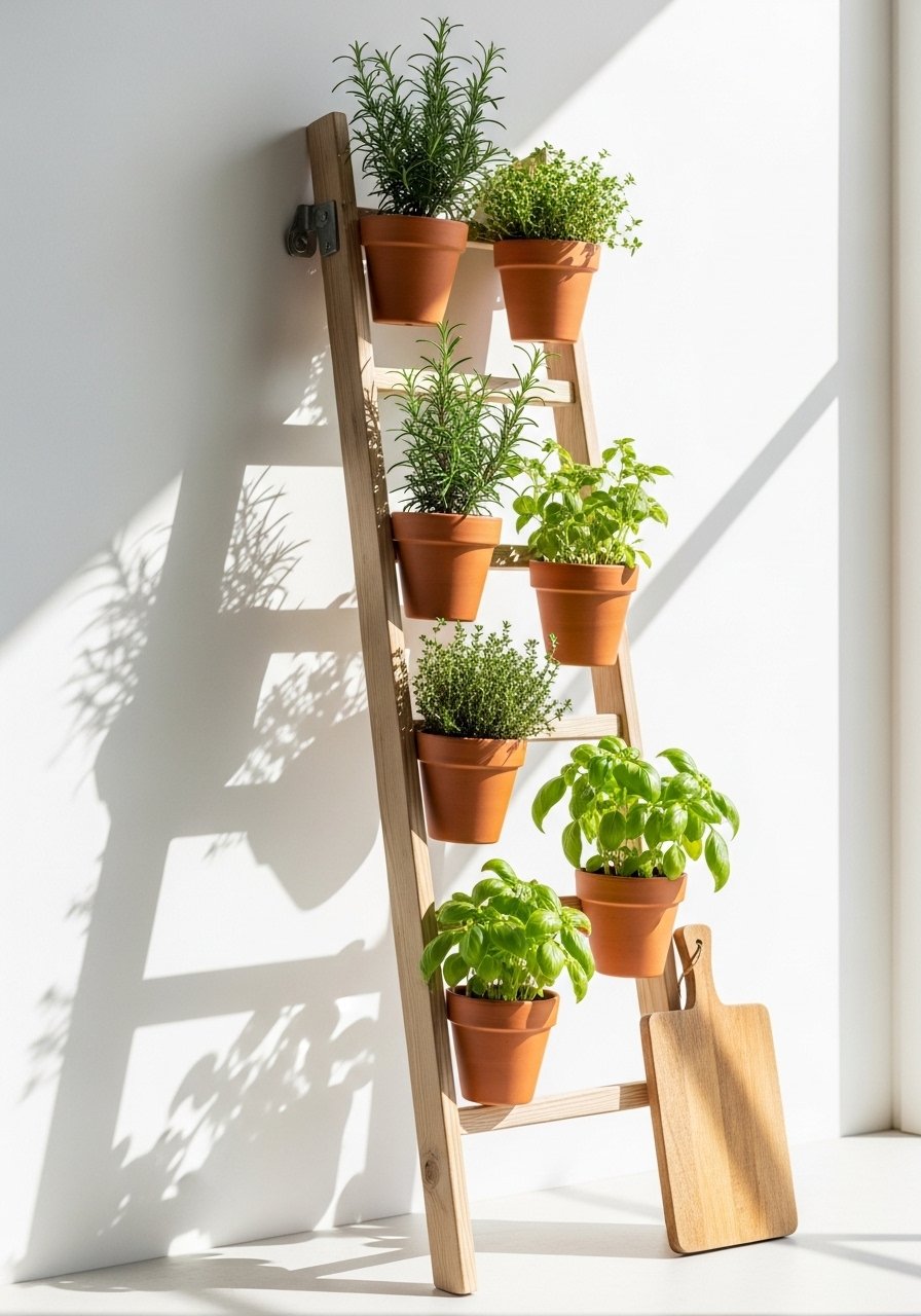 Turn a slim ladder into practical green home decor that feeds your kitchen. The vertical layout saves space and keeps fresh herbs close by. Expect fragrant rosemary and basil that add both scent and color.