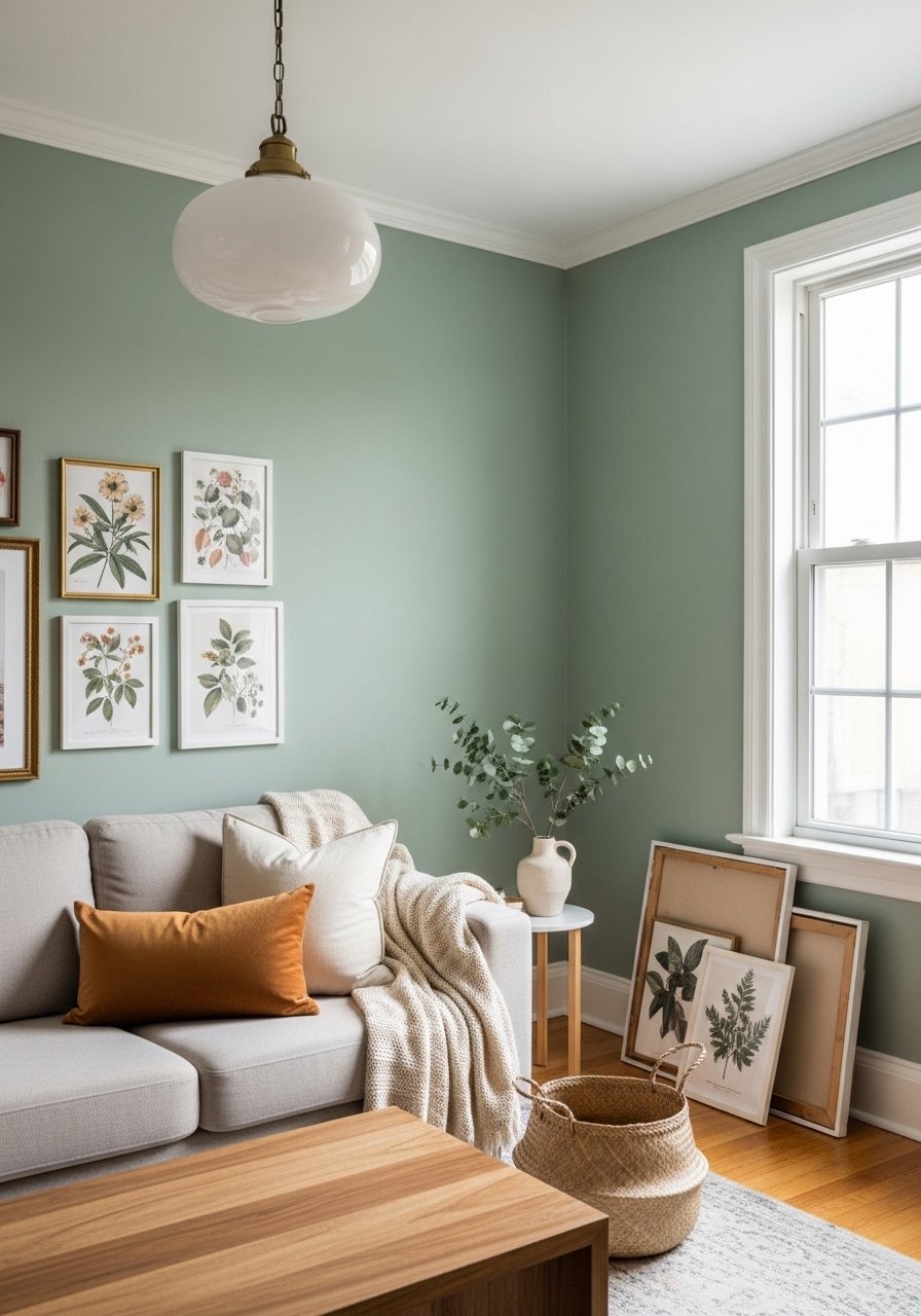 A sage accent wall grounds a room without overpowering it. The soft green reduces visual noise and pairs well with natural textures like jute and wood. This project is a quick way to refresh a room and create a calming focal point.