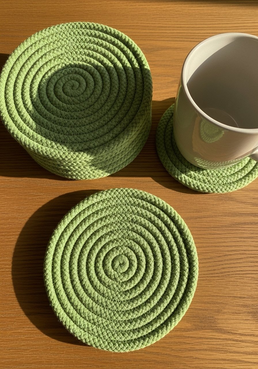 Braided rope coasters are affordable and durable. They add handcrafted charm and protect surfaces from moisture.
