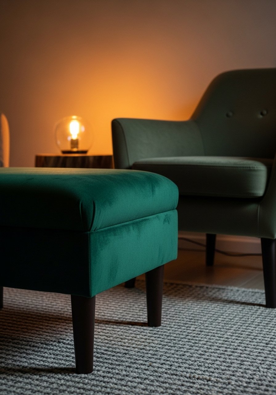 Reupholstering a small footstool in green velvet refreshes seating and adds a luxe touch. The softness invites you to rest your feet and ties into jewel-toned accents.