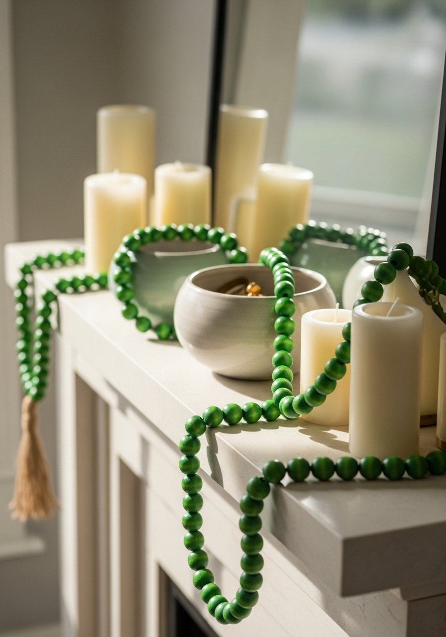 A bead garland draped along the mantel offers casual texture and movement. It layers well with candles and seasonal foliage.