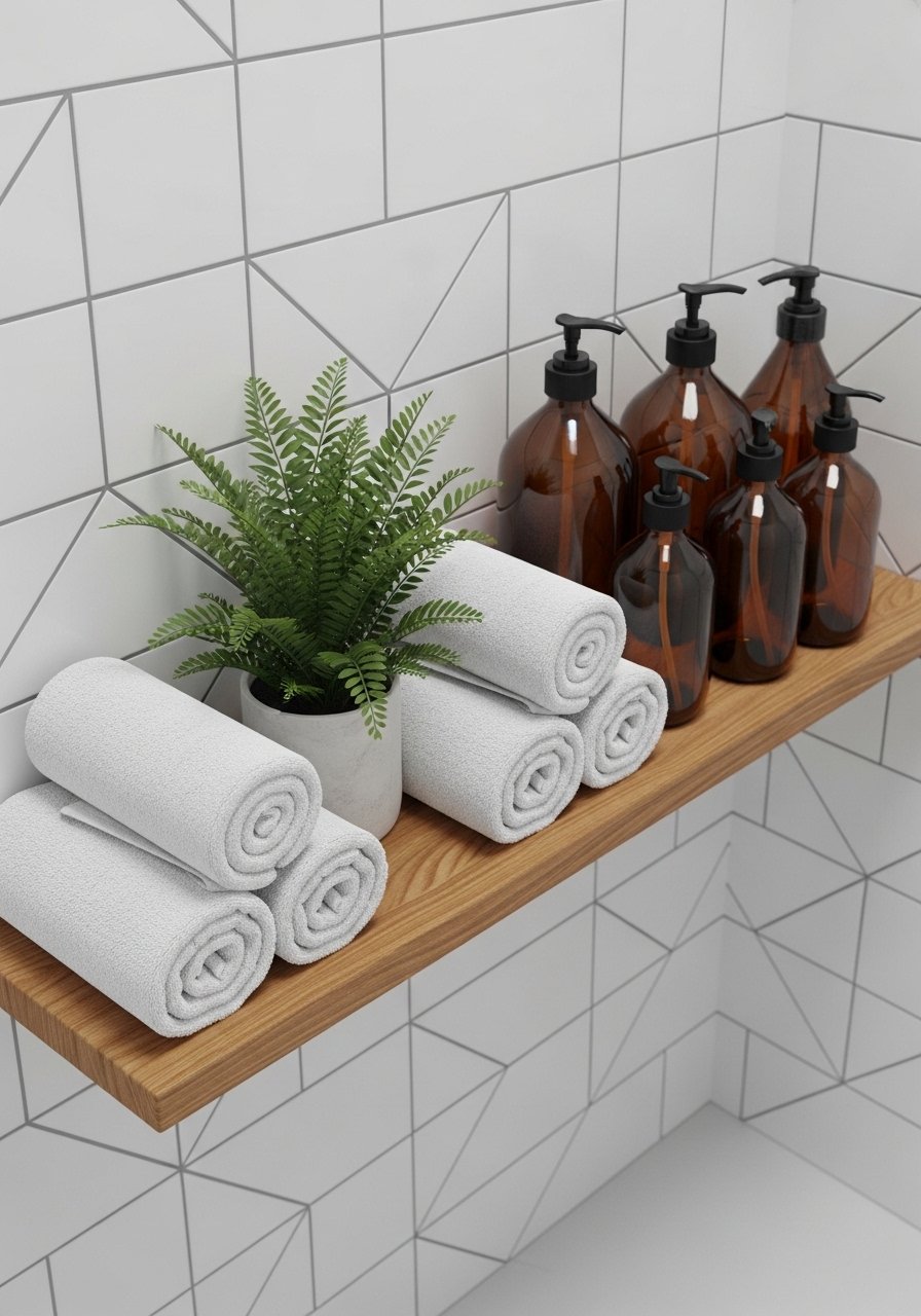 - Arrange towels, bottles, and the fern just off-center for balance.
