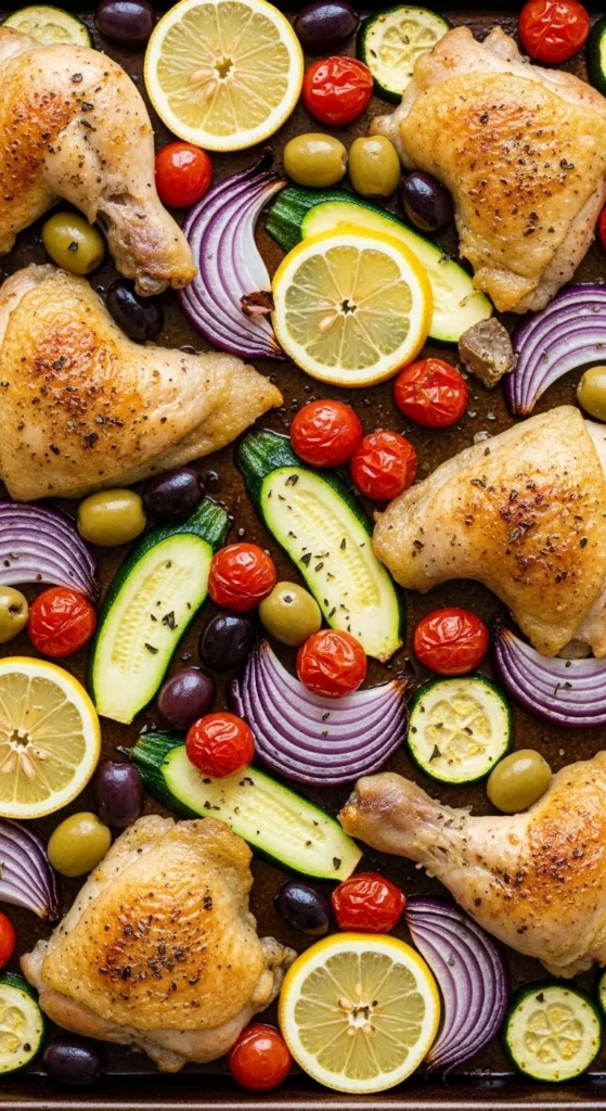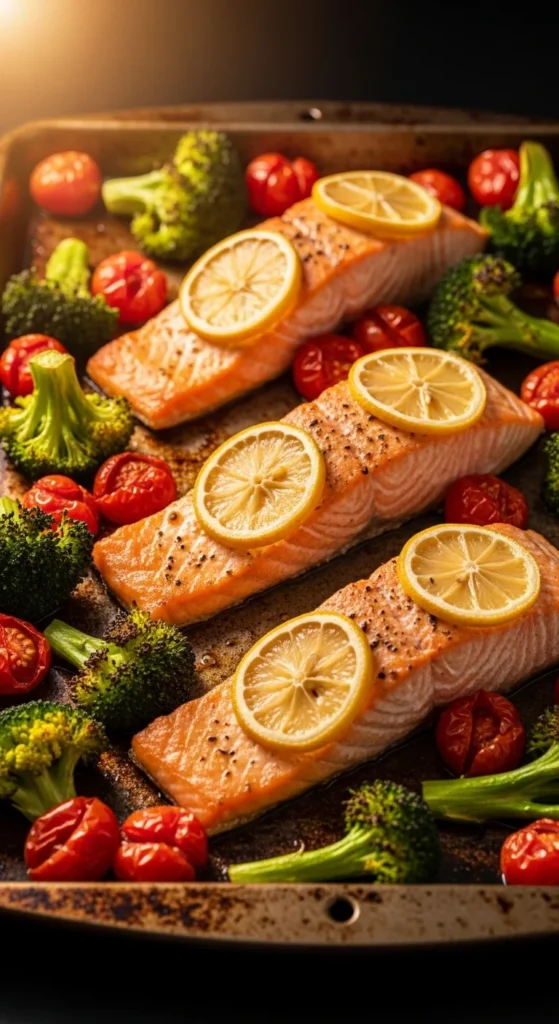 Roasted veggies caramelize on the same tray for easy cleanup.
