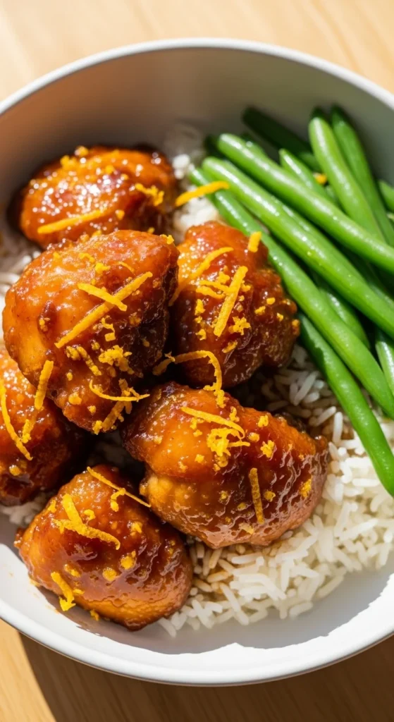 The sauce is glossy, lightly sweet, and bright from real orange.