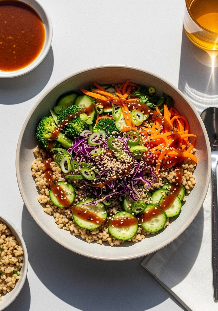 - Layer warm grain, veggies, sauce, and fresh herbs.