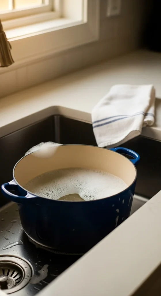 - As soon as you serve dinner, fill the pot with hot soapy water and let it soak while you eat