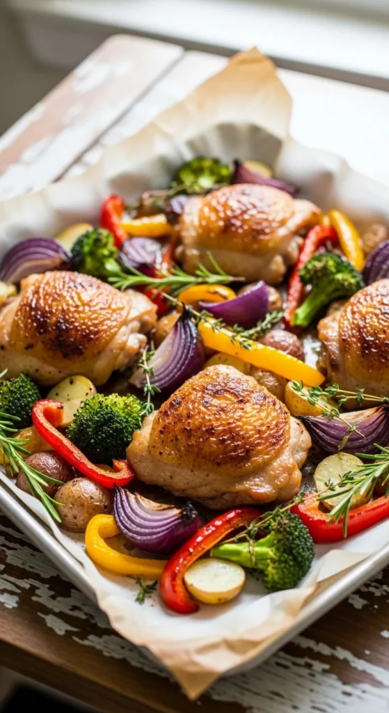 - Sheet pan: roasted chicken + veggies, “dump-and-bake” dinners