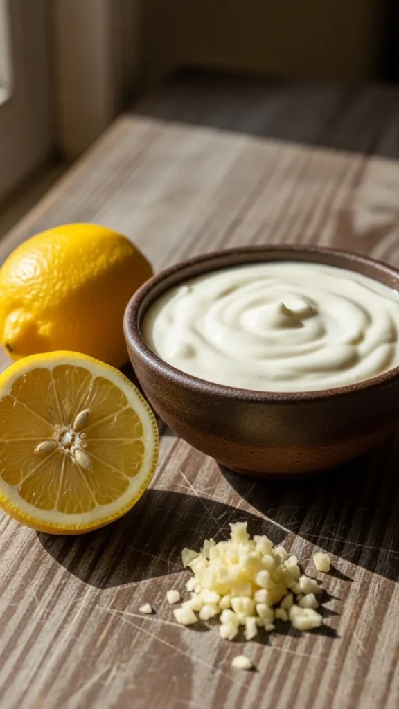 - Yogurt + lemon juice + minced garlic + salt + pepper