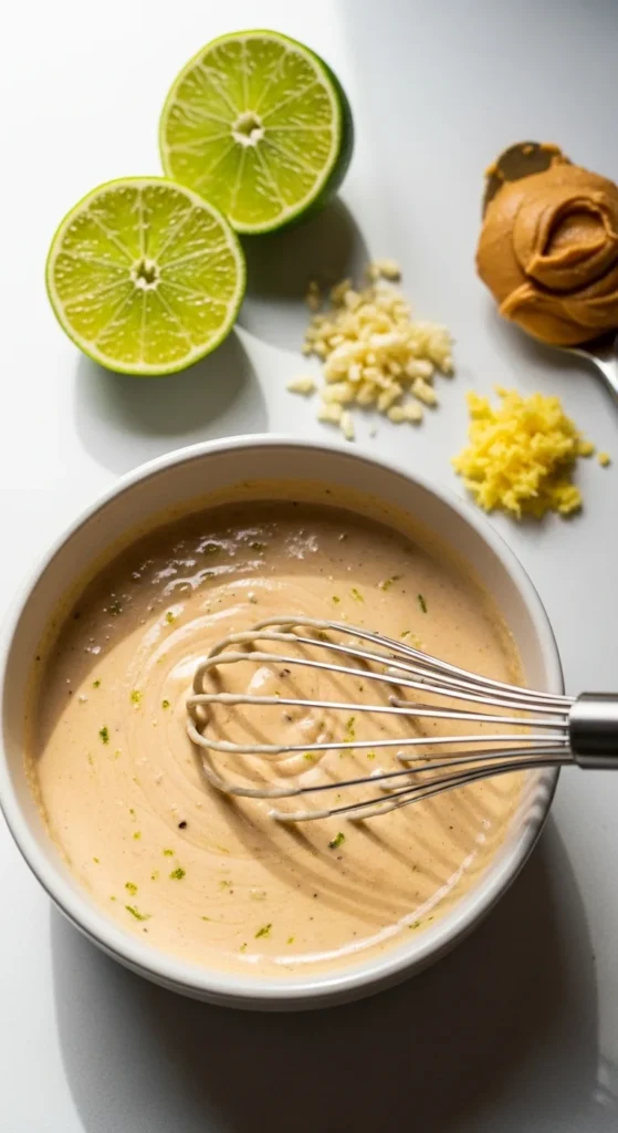 - Peanut-Lime Sauce: peanut butter + lime + soy sauce + garlic + warm water