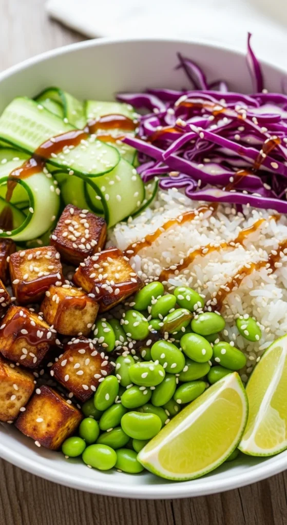 A great vegan bowl has layers. Think: base + protein + veg + sauce + crunch.