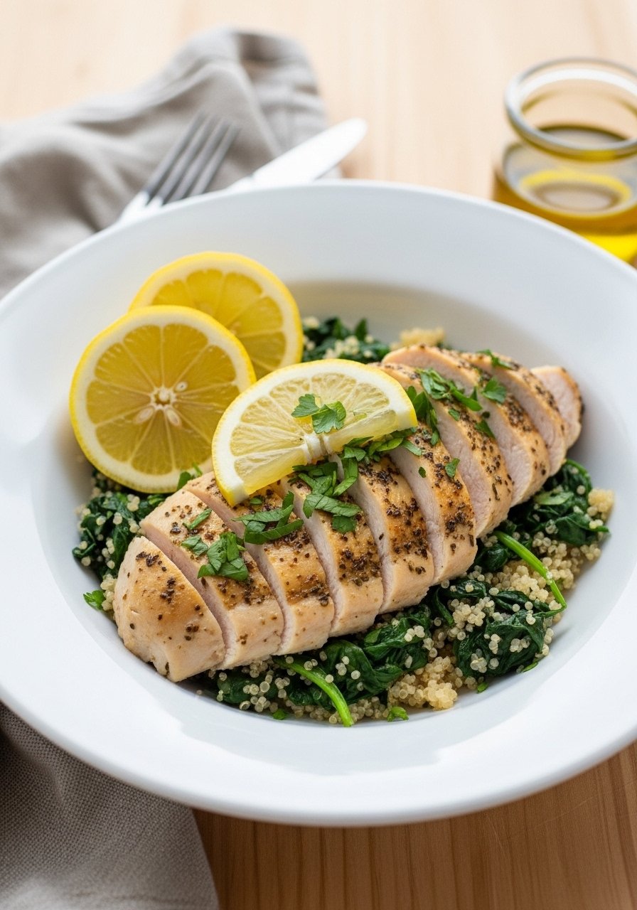 8. Slice chicken and serve over quinoa and spinach. Garnish with lemon wedges.