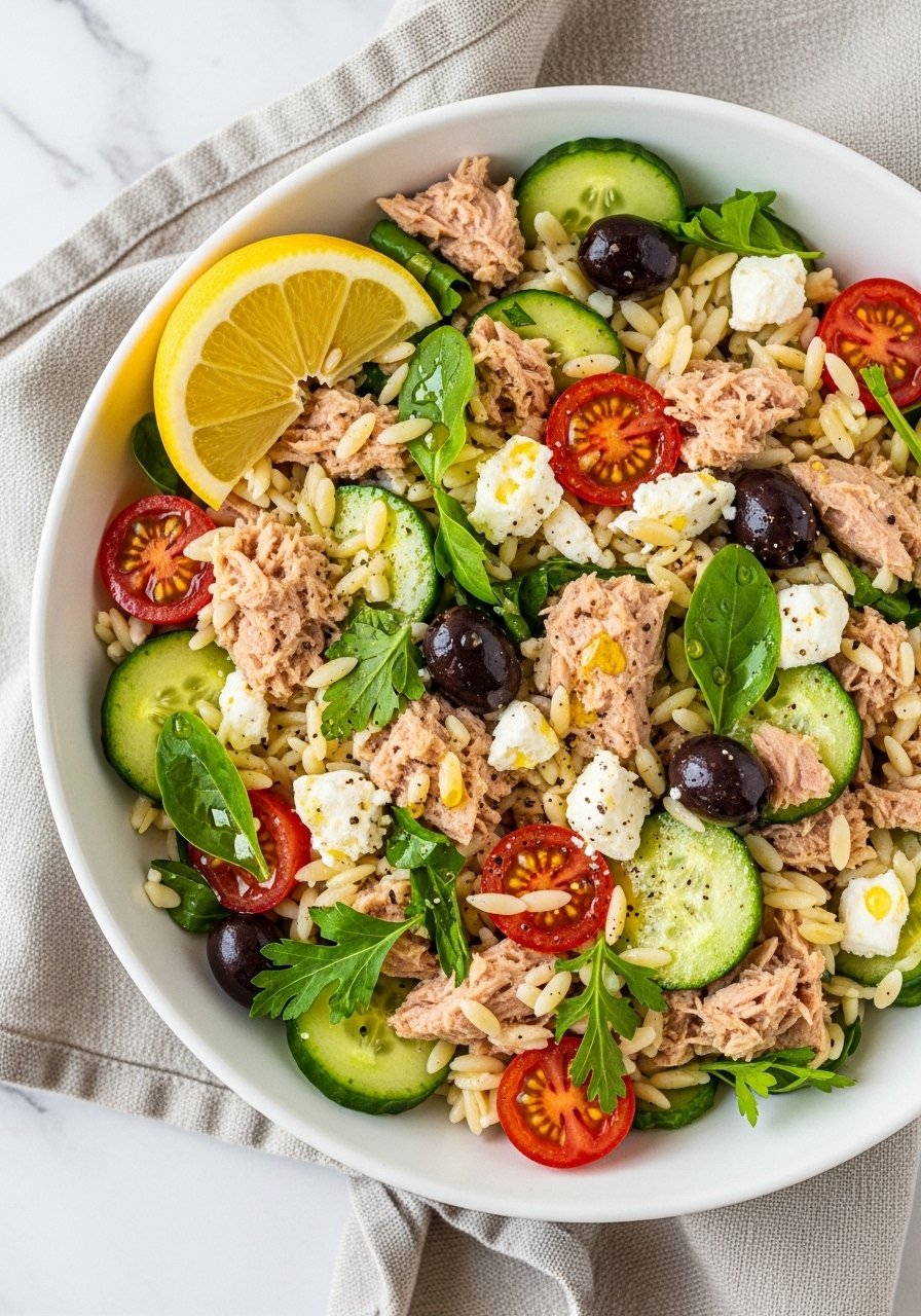 12. Greek Orzo Salad with Tuna (Quick, Mediterranean)