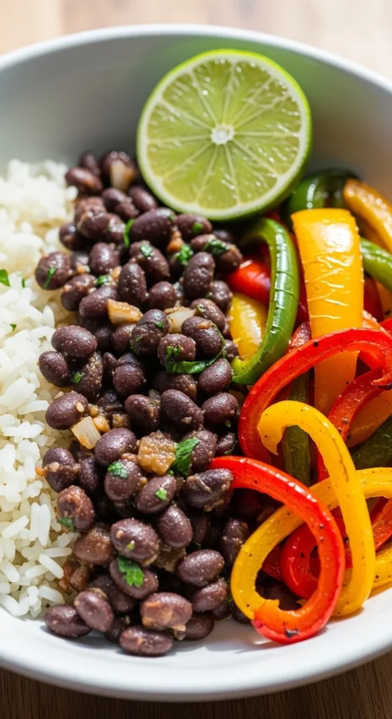 - Portion rice into containers; top with beans and peppers.