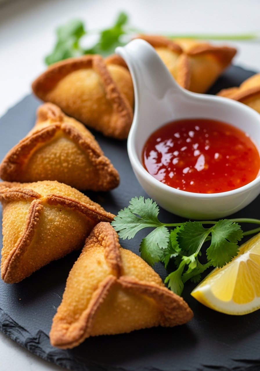 - Plate on a dark slate or white platter with small bowls of sweet chili and soy dipping sauce.