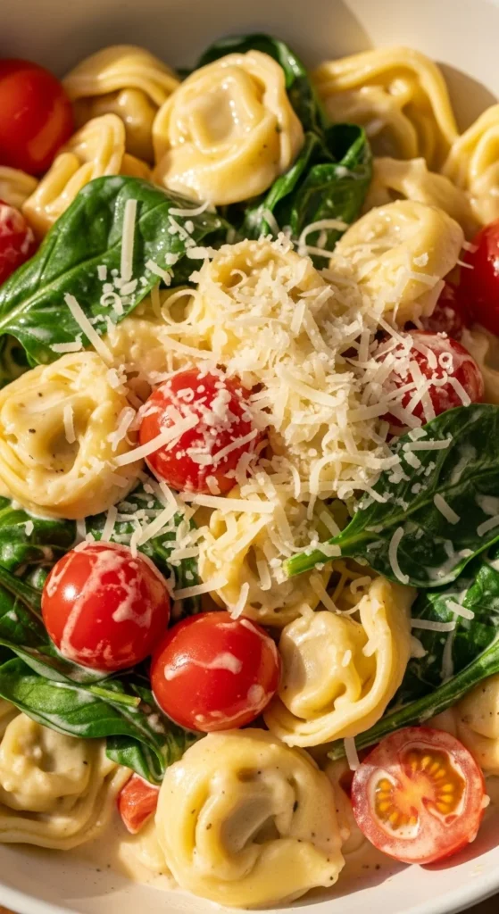 - Stir in tomatoes, spinach, and Parmesan; toss with pasta.