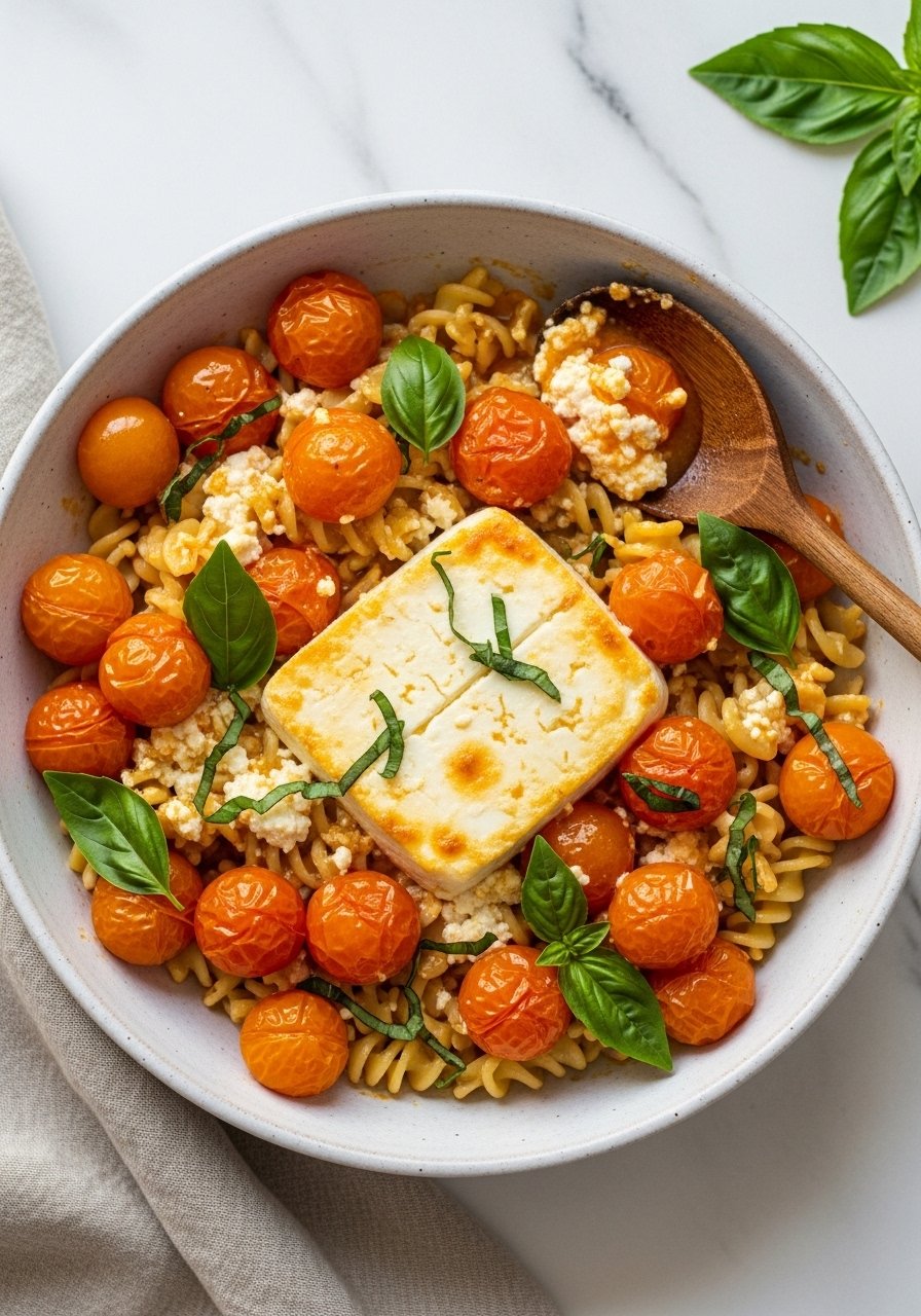 4. Roast 30–35 minutes until tomatoes are burst and edges caramelize. Feta should be soft and golden at the edges.